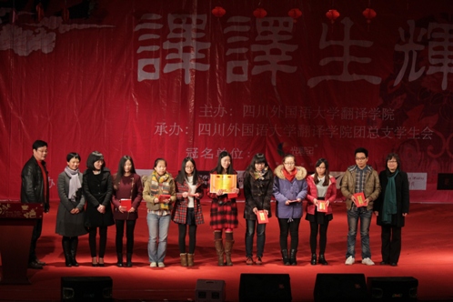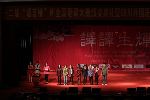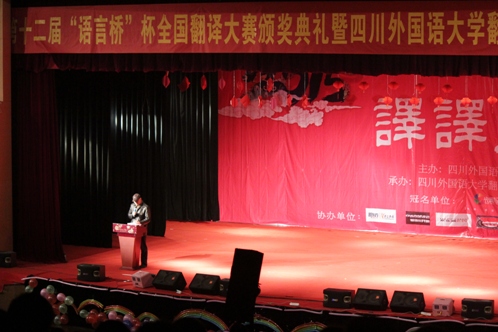 2014年12月10日晚7点,第十二届“语言桥”杯翻译大赛颁奖典礼在四川外国语大学大礼堂隆重举行。来自全国各高校的获奖选手、学生代表、各界翻译爱好者参加了本次颁奖典礼。出席本次颁奖典礼的嘉宾有四川外国语大学副校长李小川教授、语言桥集团重庆公司总经理张家庆女士、语言桥集团重庆公司市场部经理陈欢、大赛评委代表四川外国语大学严忠志教授、重庆大学外国语学院副院长黄赟林教授、四川外国语大学44118太阳成tyc城集团院长祝朝伟教授、44118太阳成tyc城集团党总支副书记郭健老师及教师代表。