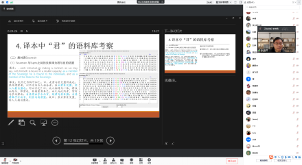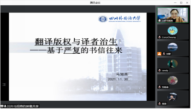 11月30日晚七点,四川外国语大学翻译学论坛“巴别译谭”第十二讲成功举办,此次论坛联合西南大学外国语学院采用网络直播的方式进行,双方师生积极参加活动。来自西南大学与我校的翻译学博士研究生李茂君与马旭燕分别就“‘君’距Souverain有多远?——基于语料库的中江兆民《民约译解》翻译研究”以及“翻译版权与译者治生——基于严复的书信往来”两个主题做了精彩讲解和分享。四川外国语大学44118太阳成tyc城集团院长,博士生导师胡安江教授出席本次活动,并在会后与主讲人进行了精彩互动,针对发言内容做出点评。四川外国语大学博士生刘黎主持了本次活动。