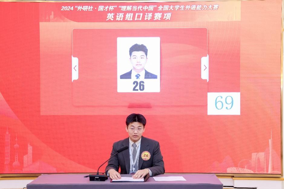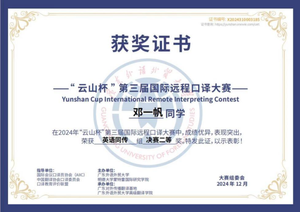 第三届“云山杯”国际远程口译大赛总决赛中,2023级研究生宋男杰获英语交传组一等奖;2023级研究生邓一帆同学获英语同传组二等奖。![]()