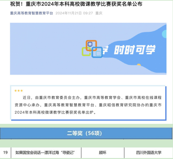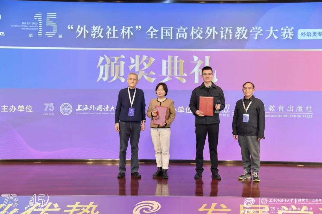 我院教师黄钰洁在第十五届“外教社杯”全国高校外语教学大赛重庆赛区决赛中荣获特等奖,并勇夺全国总决赛翻译专业组比赛一等奖;杨志亭老师领衔的团队(杨志亭、徐汉杰、李圆圆、王彦心、张家红、罗鸿春)在全国首届 MTI 教学案例大赛中,提交的参赛作品“讲好重庆能源故事 助塑中国科技形象——以《提升能源供给含‘绿’量》文本翻译为例”获笔译组三等奖;顾环老师的微课作品《如果国宝会说话-漂洋过海“寻瓷记”》在重庆市本科高校微课大赛中荣获二等奖;李希希老师在重庆市青年教师授课大赛中获二等奖;钟毅老师在重庆市教学创新大赛中获得正高组三等奖;李亮老师的思政案例《以文化育人 传中国家风---44118太阳成tyc城集团特色三全育人》在“重庆市‘大思政课’建设文化育人典型案例征集评选活动”中荣获二等奖。