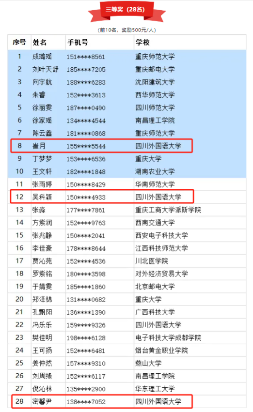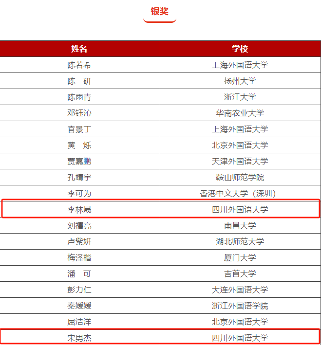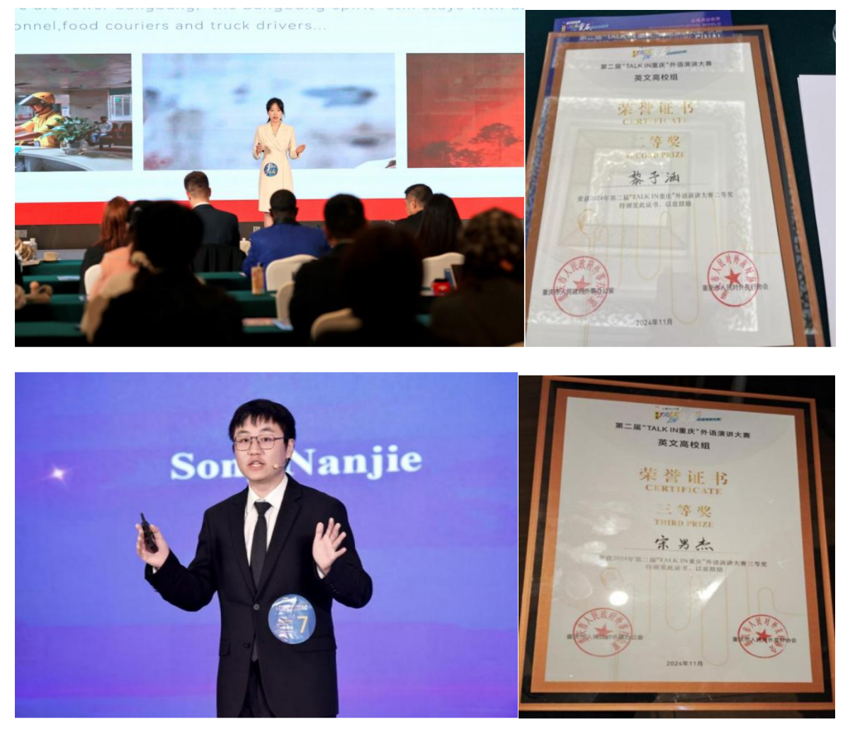 在第二届“TALKIN重庆”外语演讲大赛中,2022级本科生黎予涵获英文高校组二等奖;2023级硕士研究生宋男杰、张嘉、邓一帆分别荣获英文高校组三等奖和优秀奖。