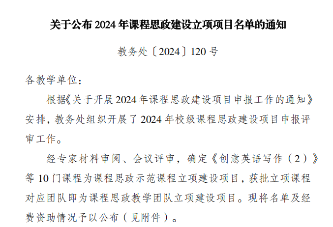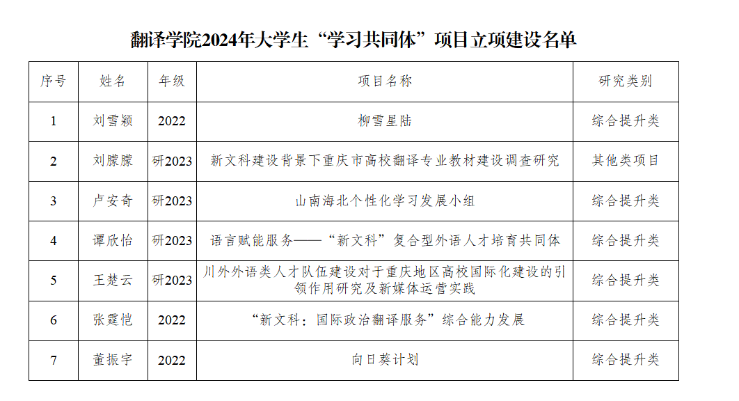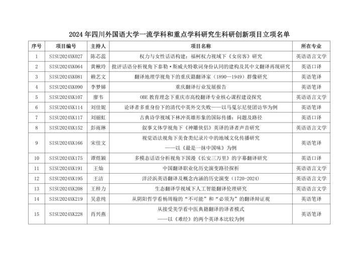 2024年研究生科研创新项目,我院学子有7个项目获推至2024年重庆市研究生科研创新项目;10个项目获得2024年四川外国语大学校级研究生科研创新项目,其中校级重点项目3个,校级一般项目7个;25个项目获得2024年四川外国语大学一流学科和重点学科研究生科研创新项目。