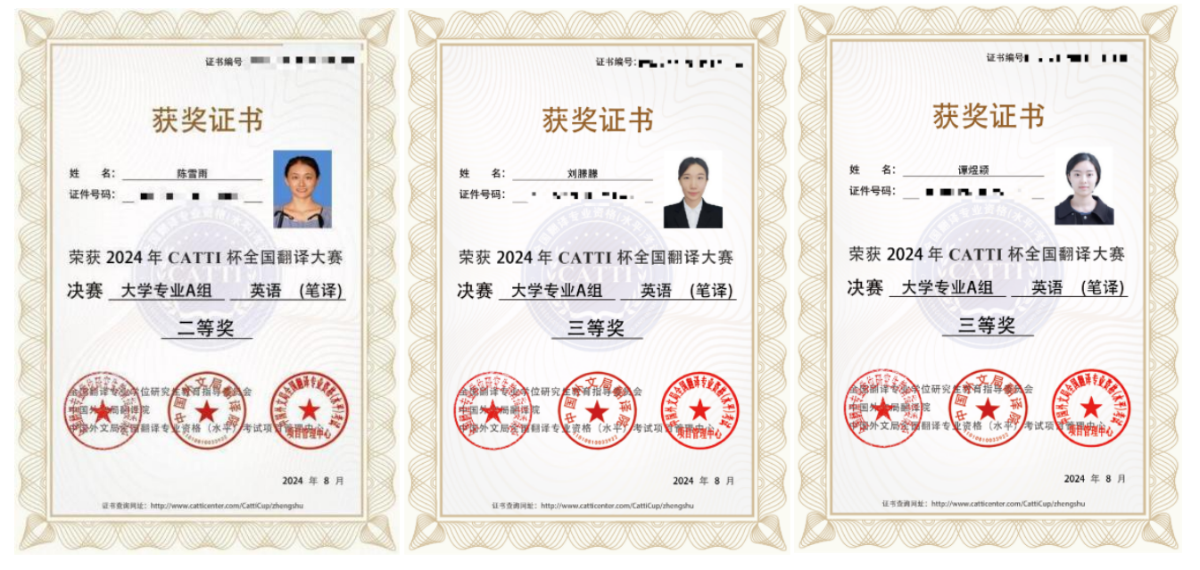 2024年第三届CATTI杯全国翻译大赛决赛中,我院2021级本科生陈雪雨获得大学组英语笔译二等奖,2023级研究生刘朦朦、谭煜颖、唐尧玲、幸梓获得大学组英语笔译三等奖,2021级本科生杨证淇获得大学组英语口译二等奖,2023级研究生王德栋获得大学组英语口译三等奖。