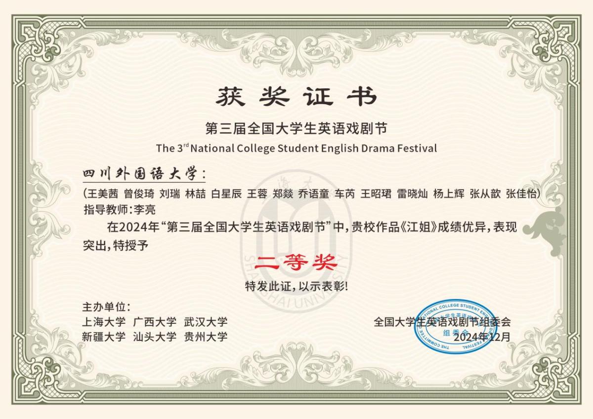 英语剧《江姐》获校2024年外语晚会一等奖、第三届全国大学生英语戏剧节二等奖。