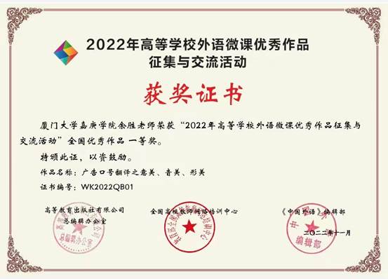 在“2022年高等学校外语微课优秀作品征集与交流活动”(原中国外语微课大赛)中,我院2014级MTI英语口译2班毕业生余胜以本科英语组第一名的成绩荣获全国一等奖。其微课《广告口号翻译之意美、音美、形美》是该活动自举办以来首个以翻译教学为主题获得英语组第一名的作品。