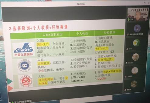 第三期分享会,我们邀请到了在商会和企业工作的四位校友魏冰、金晶、查姗姗、杨玉琪进行分享。四位校友分别从自己所在行业对从业人员能力素质的各项要求出发,建议同学们保持主动,获取信息,做出最符合自身情况与定位的就业选择。