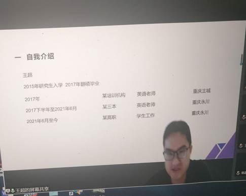 为了促进毕业生就业工作,引导同学们明确职业规划、提高就业质量,本学期我院组织开展了良师“译”友,“职”引未来校友就业经验系列分享会。系列分享会共分为四期,采用线上形式,邀请了各个领域的优秀校友们结合自身经历展开经验分享,帮助同学们“职”点迷津,“职”引未来。面对同学们对于教资考试的需求,第一期分享会我们邀请到了谭阳阳、艾自珍、程乙家三位就职于学校的校友就如何把握时代机遇,发挥专业优势,在应聘中突出重围和同学们进行了交流。