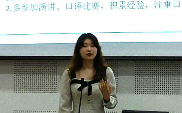 成依果同学为同学们梳理了保研时间线并强调了自主学习的重要性。她鼓励学弟学妹们利用本科阶段多参加各类比赛和实践活动,以赛促练,以赛促学。此外,还就同学们比较关心的高翻队的学习和实践进行了讲解和答疑,鼓励大家积极踊跃参与高翻队的选拔和锻炼。