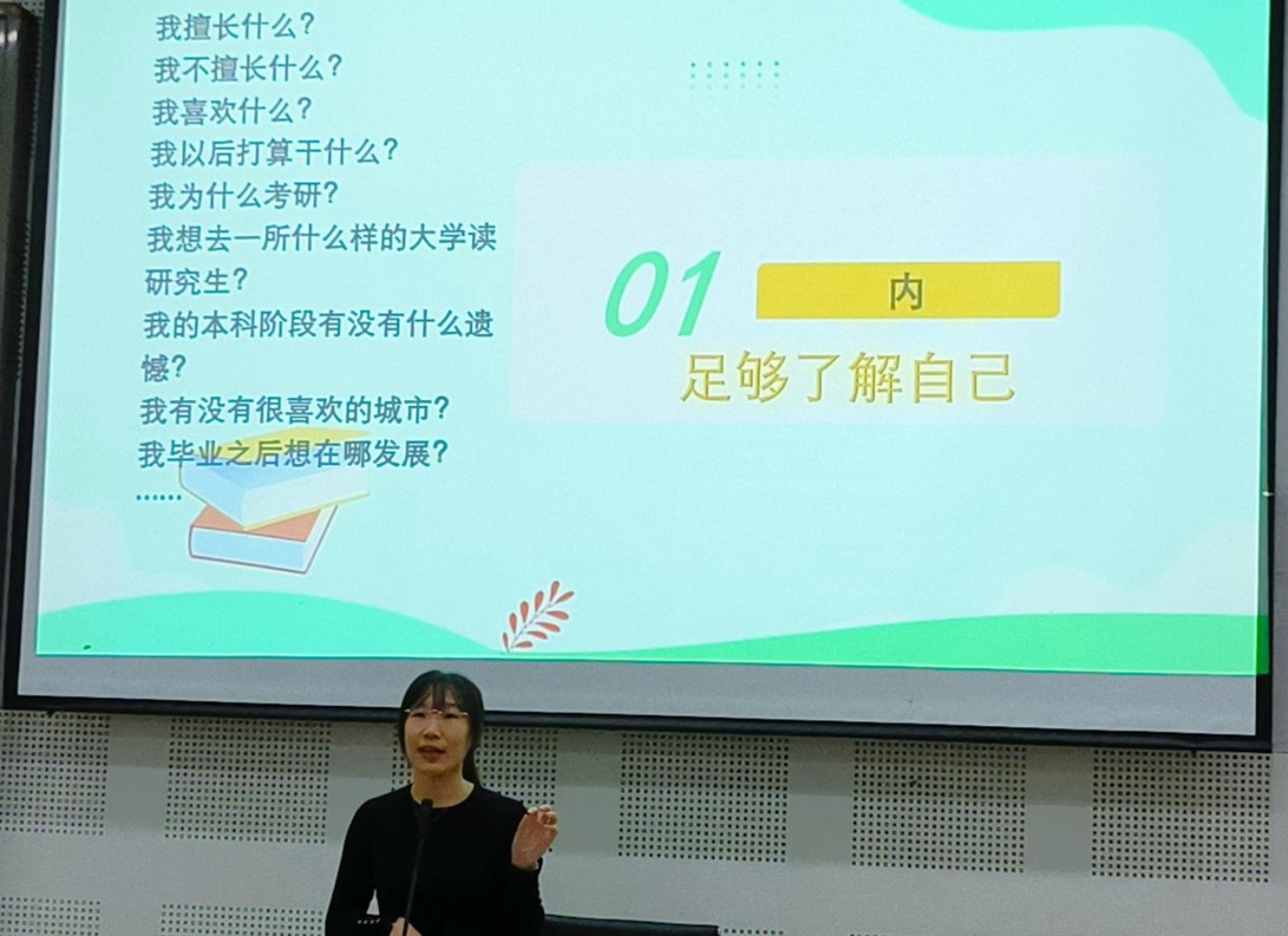 刘朦朦从内,外,知,行四个方面向学弟学妹们分享了自己的考研经验。内,即要足够了解自己的考研动机;外,即做好信息调研,打破信息茧房;知,即构建完整的知识体系,尽可能多学知识;行,即贵在行动,结果不会辜负每一个努力付出的人。最后,刘朦朦学姐送给大家一句话,“Your dreams won’t come true, something greater will.”