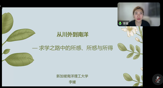李媛校友目前是新加坡南洋理工大学的在读博士生,主要从事中国政府白皮书英译研究。本次分享主题为“从川外到南洋——求学之路中的所感、所惑与所得”,分为读研回顾、博士申请和问答三个环节。她首先回顾了三年的研究生生活,“政府实习”和“学术研究”是这段生活的关键词。李媛着重提到研一假期在重庆两江新区管委会实习的经历,认为这段经历为她未来的研究方向做了铺垫。随后,她从专业确定、备考经验、复试经验三个方面为大家分享了博士申请阶段具体细节,“要针对目标院校的要求进行有策略的准备,包括语言要求、学位证、成绩单、推荐信、简历等”。学校的层次可以从平台、就业前景和学术氛围这三个方面来选择自己心仪的大学。